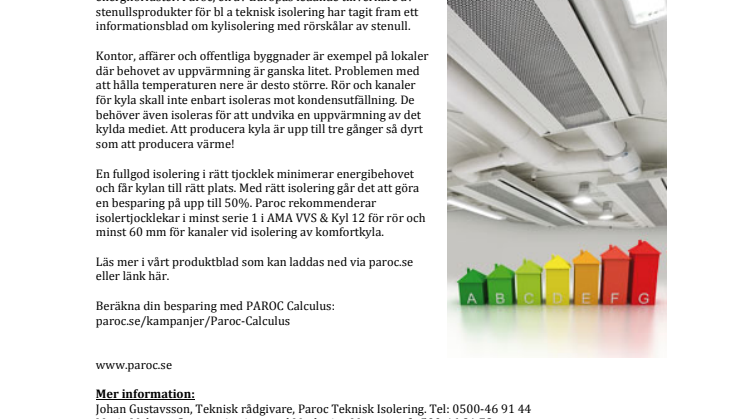 Långa kylledningar och ventilationskanaler kan ge stora energiförluster. Paroc, en av Europas ledande tillverkare av stenullsprodukter för bl a teknisk isolering har tagit fram ett informationsblad om kylisolering med rörskålar av stenull.