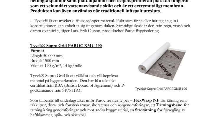 Tyvek® Supro Grid är ett välkänt och väl beprövat material på byggmarknaden. Den har bl a tekniskt certifikat från BBA (British Board of Agrément) och P-godkännande från SP/SITAC.