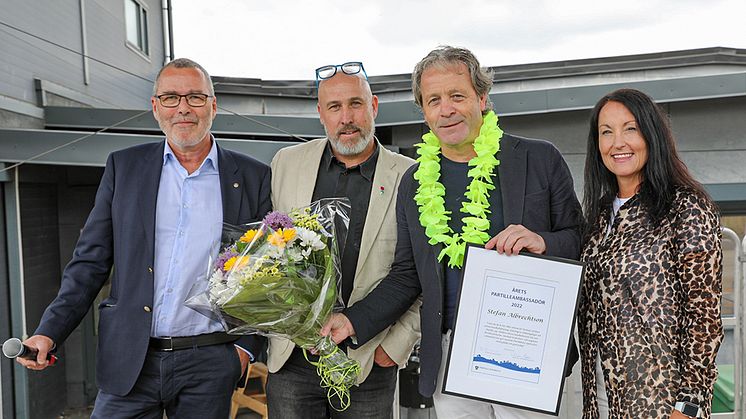 Prisutdelning av årets ambassadörspris. På bilden från vänster: Per Bäckström, kommundirektör, Thorbjörn Carlsson (S), vice ordförande kommunstyrelsen, Stefan Albrechtson, klubbdirektör för Sävehof och Marith Hesse (M) ordförande kommunstyrelsen.