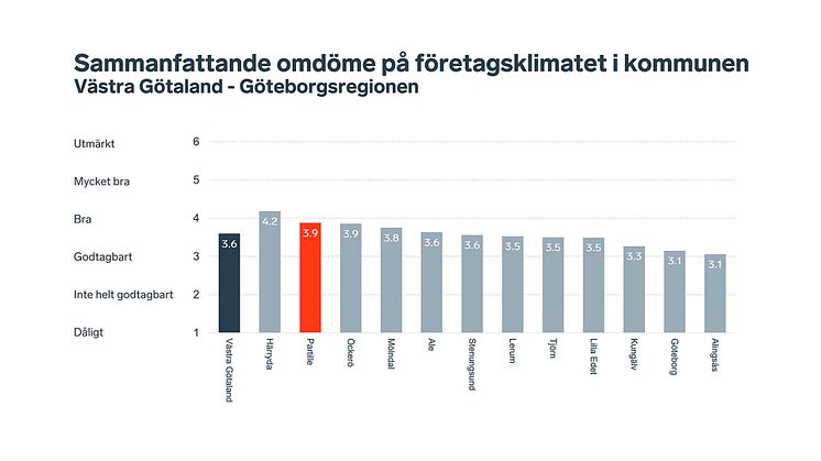 Rikssnittet för företagens sammanfattande omdöme om företagsklimatet i Sveriges kommuner är 3,47 (2023: 3,46). För Göteborgsregionens 13 kommuner var snittet 3,59 (2023: 3,49) och för samtliga kommuner i Västra Götalands län var snittet 3,6 (2023: 3,5).