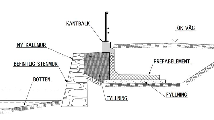 Kommunen har valt en modern lösning med äldre stil för den nya stödmuren. Förgjutna betongelement kommer att användas och packas med dränerande material som sten och grus, på vilket vägen sedan anläggs på nytt. Vägens utformning kommer att vara liknande dagens, med ett körfält i varje riktning. Målet är att stödmuren ska smälta in i den äldre bruksmiljön med kallmurad ytterdel. Även belysningen på sträckan kommer att bytas ut.