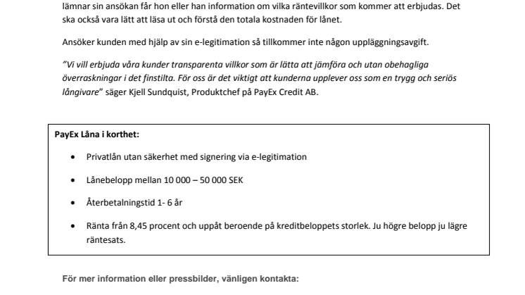 ”Vi vill erbjuda våra kunder transparenta villkor som är lätta att jämföra och utan obehagliga överraskningar i det finstilta. För oss är det viktigt att kunderna upplever oss som en trygg och seriös långivare” säger Kjell Sundquist, Produktchef på PayEx Credit AB.