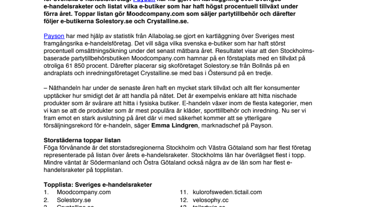 Payson har med hjälp av statistik från Allabolag.se gjort en kartläggning över Sveriges mest framgångsrika e-handelsföretag. Det vill säga vilka svenska e-butiker som har haft störst procentuell omsättningsökning under det senast mätbara året. Resultatet visar att den Stockholms-baserade partytillbehörsbutiken Moodcompany.com hamnar på en förstaplats med en tillväxt på otroliga 61 850 procent. Därefter placerar sig skoföretaget Solestory.se från Bollnäs på en andraplats och inredningsföretaget Crystalline.se med bas i Östersund på en tredje.