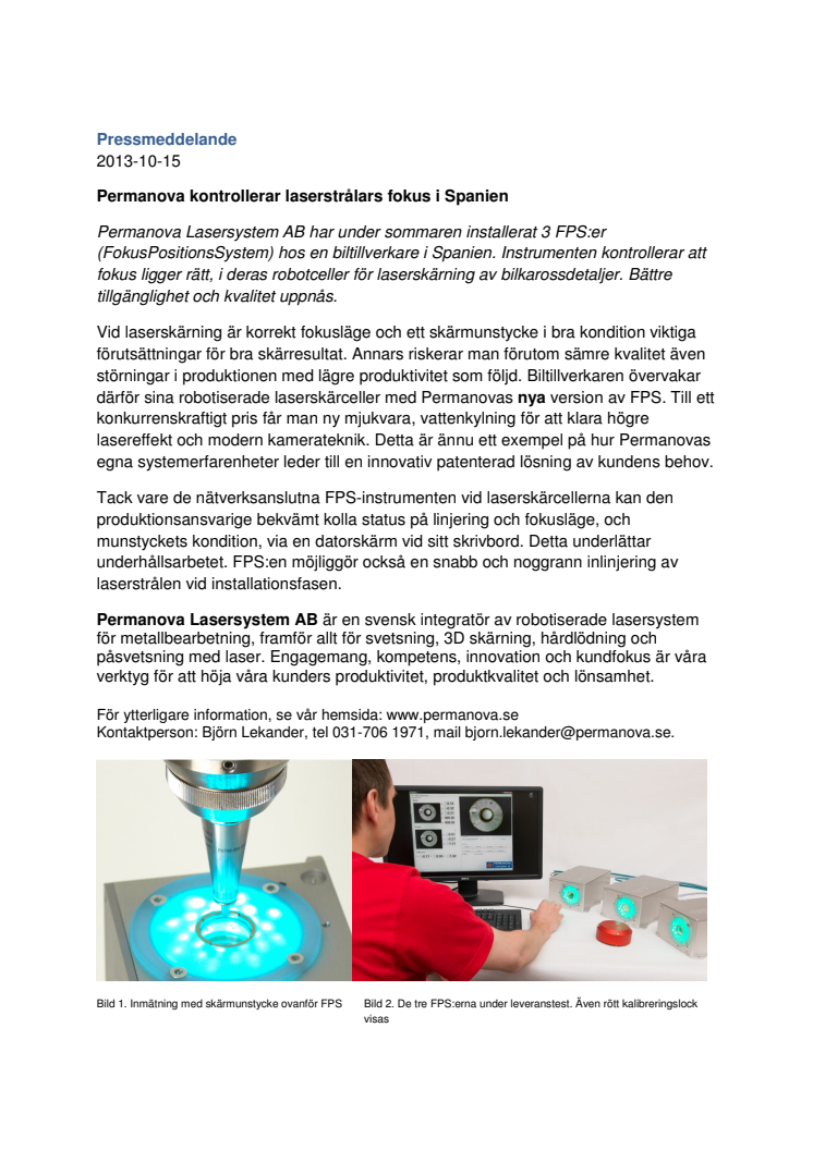 Permanova Lasersystem AB har under sommaren installerat 3 FPS:er (FokusPositionsSystem) hos en biltillverkare i Spanien. Instrumenten kontrollerar att fokus ligger rätt, i deras robotceller för laserskärning av bilkarossdetaljer. Bättre tillgänglighet och kvalitet uppnås.