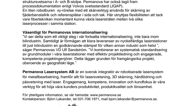 ”Vi ser detta som ett viktigt steg i vår fortsatta internationalisering, inte bara inom bilindustrin. Samtidigt är förmågan att klara leveranser av nyckelfärdiga laserstationer till just bilindustrin en godkännande-stämpel för vilken annan industri som helst ”, säger Permanovas VD Ulf Sandström. ”Vi kombinerar en systematisk standardisering av grundmoduler i våra laserstationer med effektiv projektledning och engagerade, kompetenta projektingenjörer. Detta lägger grunden för framgångsrika projekt, oberoende av geografiskt läge.”