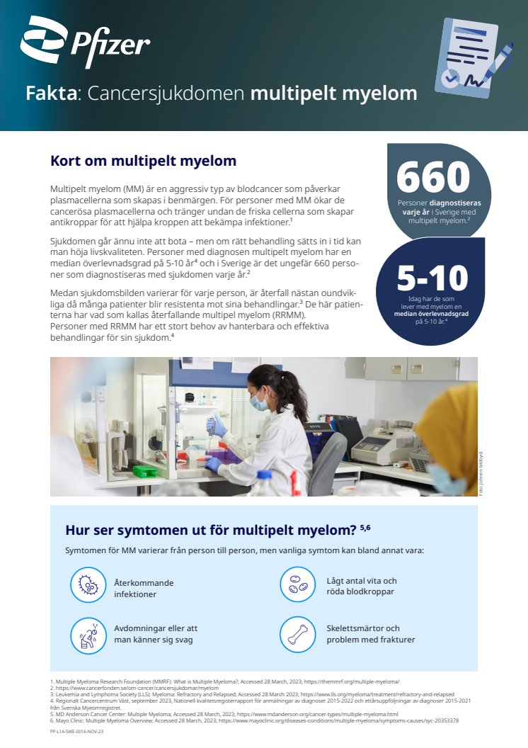 Multipelt myelom (MM) är en aggressiv typ av blodcancer som påverkar plasmacellerna som skapas i benmärgen. I faktabladet kan du ta del av kort information om multipelt myelom.