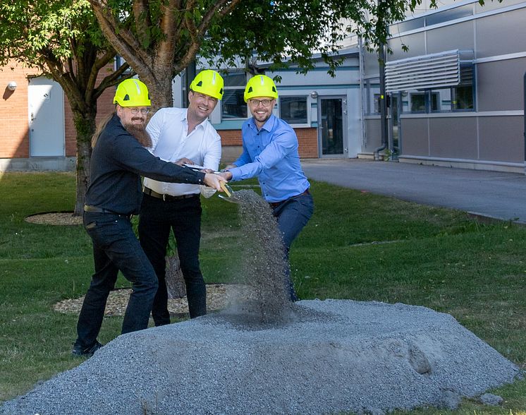 Här tas första spadtaget till den nya utbygganden av Pfizers tillverkningsanläggning i Strängnäs. På bild fr vänster, Mikael Brunell, Johan Carlsson och Jakob Holmlund
