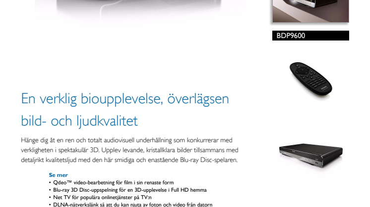 3D är för hemma-cineasten vad turbon är för den körglade. Men turbo gör ingen nytta om inte prestandan i övrigt är av hög klass. Därför levererar Philips Blu-ray BDP 9600 film i HD och med hjälp av Qdeo videoprocess-teknologi en upplevelse av absolut högsta klass.