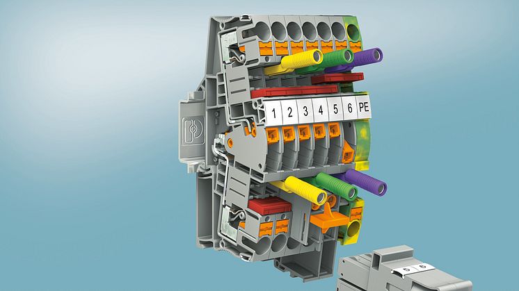 Ledaranslutning i plintarna sker via Push-In anslutning – enkel och felfri anslutning direkt, då ledaren trycks in i anslutningsutrymmet utan behov av några extra verktyg. För att öppna anslutningsutrymmet behöver användare endast trycka på den orangea knappen.