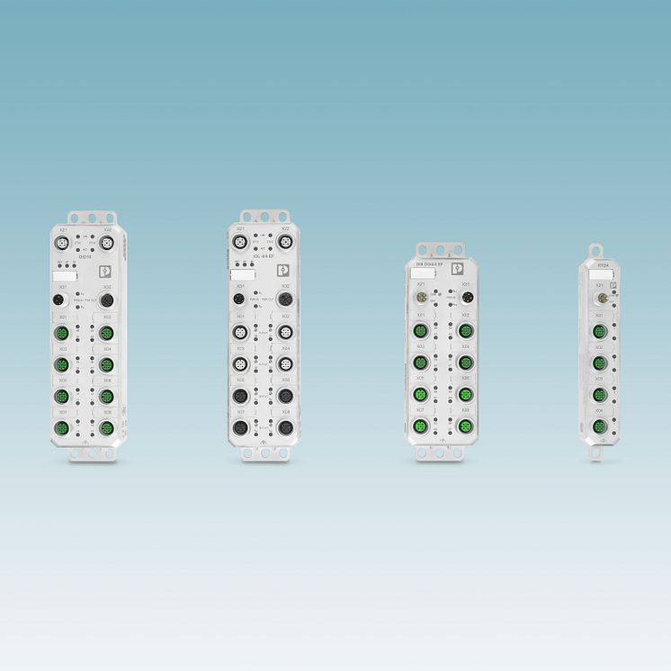 Den nya serien av IP65/IP67 skydda I/O-moduler i gjutna zink die-cast kapslingar, är optimerade för montage direkt på maskinen även i extremt tuffa miljöer. De första enheterna I den nya plattformen består av digitala in och utgångsmoduler, samt IO-Link mastrar för Profinet. Samtliga enheter har M12 matningskontakter med L-kodning som kan hantera upptill 2 x 16 A matning. Dessutom kompletteras serien med IO-Link I/O boxar/hubbar med åtta digitala in och åtta digitala ut, samt hubbar med fyra analoga ingångar för temperaturgivare. Samtliga anslutningar på de nya enheterna sker anslutningen med valfritt med den nya M12 anslutningen med snabbanslutningar av typen”push pull”, men är även bakåtkompatibel traditionella ”gängade” M12 kontakter.