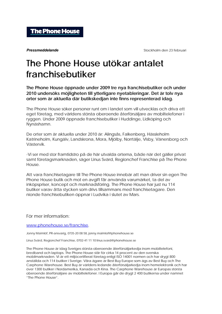 The Phone House öppnade under 2009 tre nya franchisebutiker och under 2010 undersöks möjligheten till ytterligare nyetableringar. Det är tolv nya orter som är aktuella där butikskedjan inte finns representerad idag.