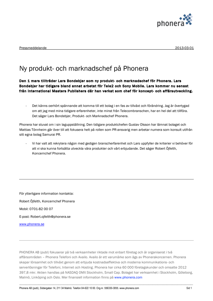 Den 1 mars tillträder Lars Bondebjer som ny produkt- och marknadschef för Phonera. Lars Bondebjer har tidigare bland annat arbetat för Tele2 och Sony Mobile. Phonera har stuvat om i sin laguppställning. Den tidigare produktchefen Gustav Olsson har lämnat bolaget och Mattias Tönnheim går över till att fokusera helt på rollen som PR-ansvarig.