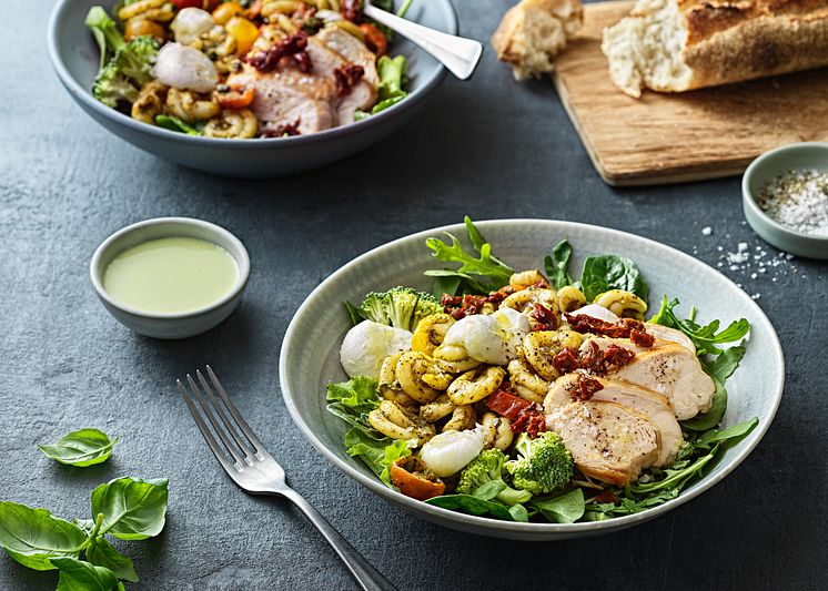 Ett recept som bygger på vår nya fantastiska pasta "Amore per Favore" med pesto, spenat och körsbärstomater. Riktigt läcker när den värms upp, och är särskilt utformad för att lyfta vårt koncept med just sallader som gör sig bra efter en kort stund i mikron. Kombinationen av supergod smält mozzarella och soltorkade tomater förstärker den italienska känslan. Vinägretten med citron och ingefära ger salladen fräschör och syra, och förstärker de andra smakerna. Citronsmaken passar dessutom perfekt ihop med tomaterna och peston i pastan.