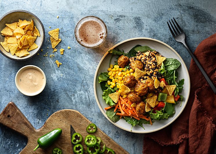 Den här salladen för tankarna till den amerikanska södern. Basen i salladen är svart quinoa- och linssallad tillsammans med grönsaker som majs och paprika, som är typiska för den här matkulturen. Våra egna sötpotatisbollar, kryddade med vitlök, paprika och spiskummin, sticker ut och ger salladen en unik touch. Som komplement till denna utsökta blandning finns vår nya dressing i smaken Jalapeño Ranch – en krämig tomatbaserad dressing med rökiga undertoner och en hint av chili. Dressingen är gjord för att förhöja smaken i värmda sallader på ett optimalt sätt.
