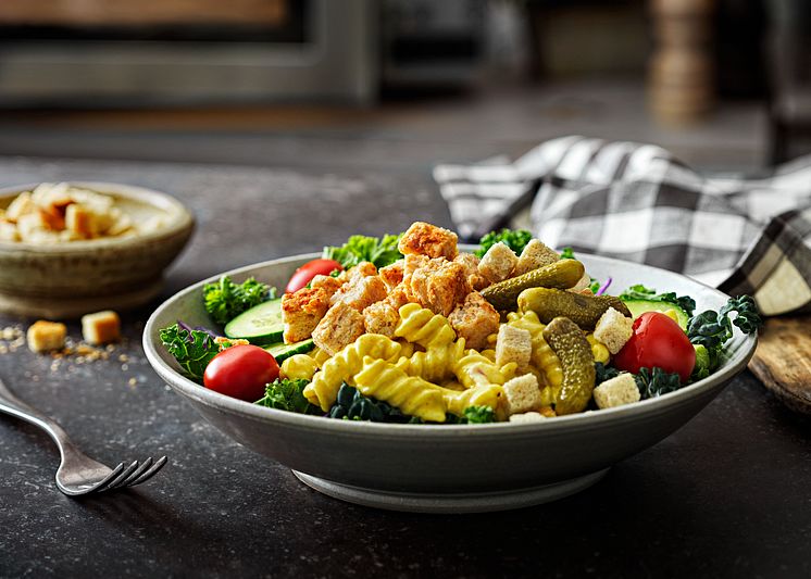 Här har vi kombinerat höstiga och mustiga smaker som blir fantastiska tillsammans när de värms. Den krämiga currypastan står i centrum och kompletteras fint av färsk gurka och tomat. Kryddiga, lakto-ovo-vegetariska BBQ-bites ger känslan av klassisk kycklingcurry. Sötsyrliga cornichons lyfter curryn och ger ett lätt sting.