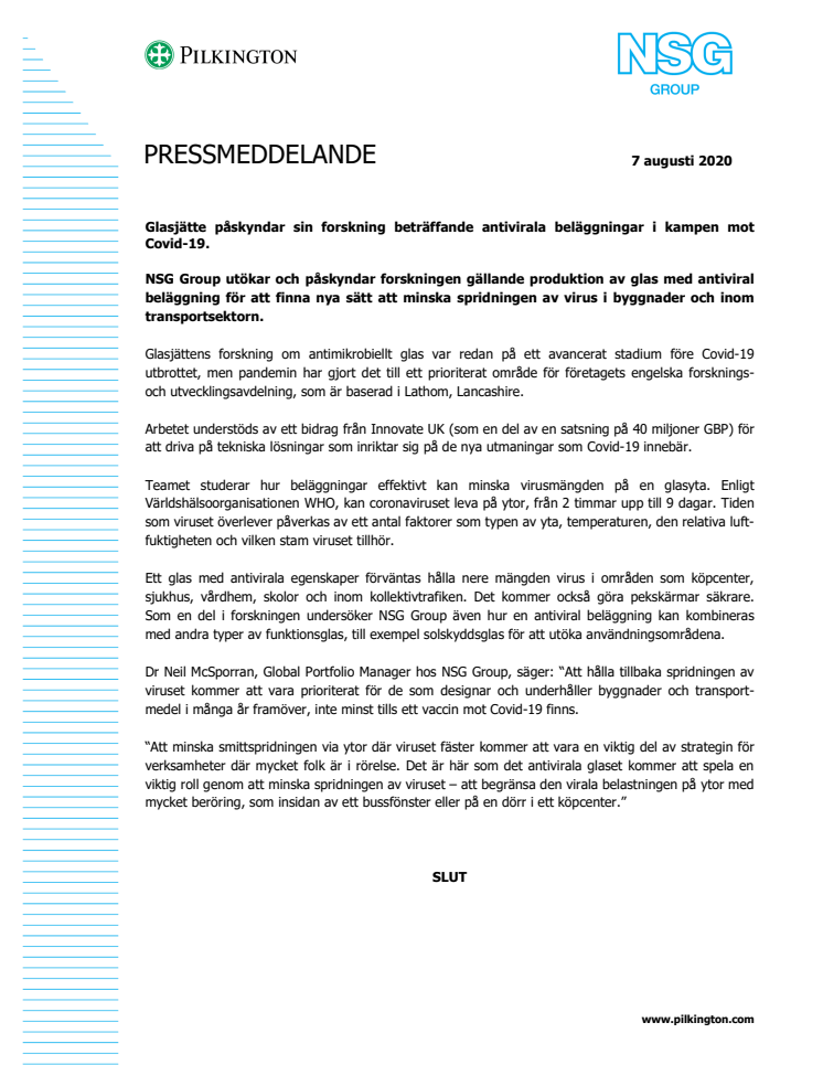 Ett glas med antivirala egenskaper förväntas hålla nere mängden virus i områden som köpcenter, sjukhus, vårdhem, skolor och inom kollektivtrafiken. Det kommer också göra pekskärmar säkrare. Som en del i forskningen undersöker NSG Group även hur en antiviral beläggning kan kombineras med andra typer av funktionsglas, till exempel solskyddsglas för att utöka användningsområdena.