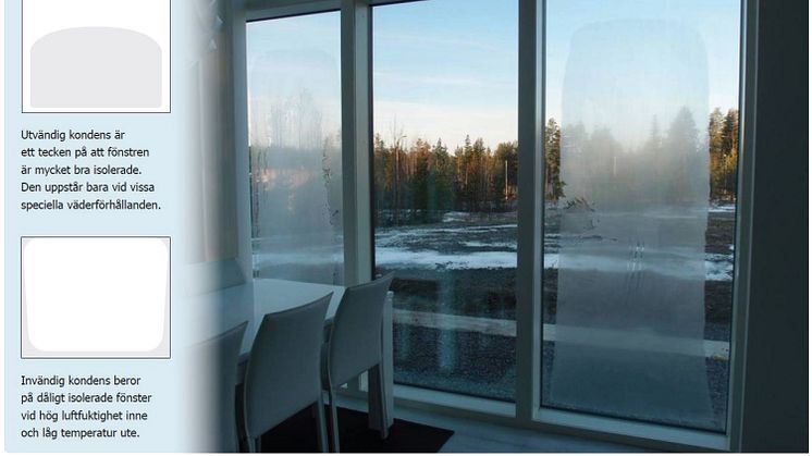 Men vänta! Det finns någonting du måste veta om välisolerade fönster innan du lämnar in din beställning. Fönster tillverkas idag med så låga U-värden att det under vissa förhållanden bildas kondens på utsidan. Vid vindstilla, kallt och klart väder kan det yttre glaset i isolerrutan förlora så mycket värme att den till och med får lägre temperatur än utomhusluften. Om luftfuktigheten samtidigt är hög kan rutans temperatur understiga daggpunkten och då bildas kondens. Energiförlusterna inifrån räcker helt enkelt inte till för att hålla ytterglasets temperatur över daggpunkten utomhus. Utvändig kondens bildas oftast på natten och precis som morgondaggen i gräset så försvinner den när solens strålar värmer luften.