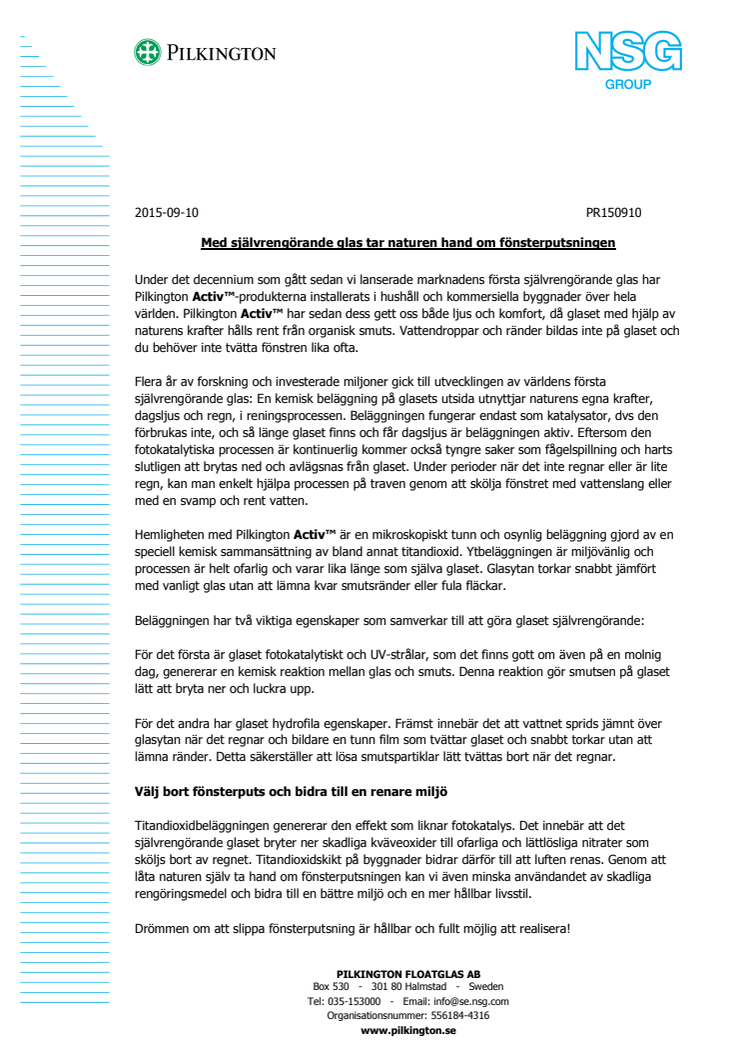 Flera år av forskning och investerade miljoner gick till utvecklingen av världens första självrengörande glas: En kemisk beläggning på glasets utsida utnyttjar naturens egna krafter, dagsljus och regn, i reningsprocessen. Beläggningen fungerar endast som katalysator, dvs den förbrukas inte, och så länge glaset finns och får dagsljus är beläggningen aktiv. Eftersom den fotokatalytiska processen är kontinuerlig kommer också tyngre saker som fågelspillning och harts slutligen att brytas ned och avlägsnas från glaset. Under perioder när det inte regnar eller är lite regn, kan man enkelt hjälpa processen på traven genom att skölja fönstret med vattenslang eller med en svamp och rent vatten.