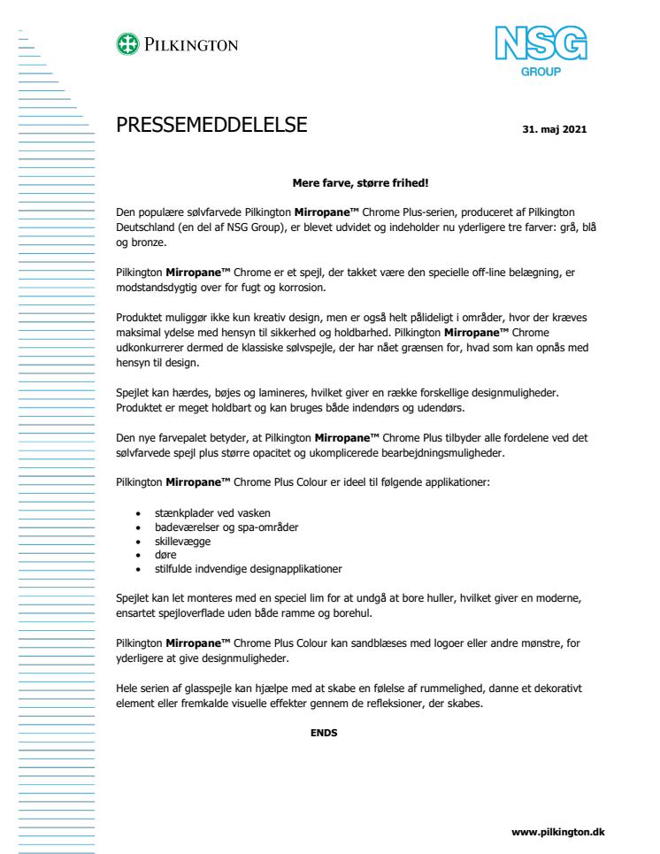 Den nye farvepalet betyder, at Pilkington Mirropane™ Chrome Plus tilbyder alle fordelene ved det sølvfarvede spejl plus større opacitet og ukomplicerede bearbejdningsmuligheder.