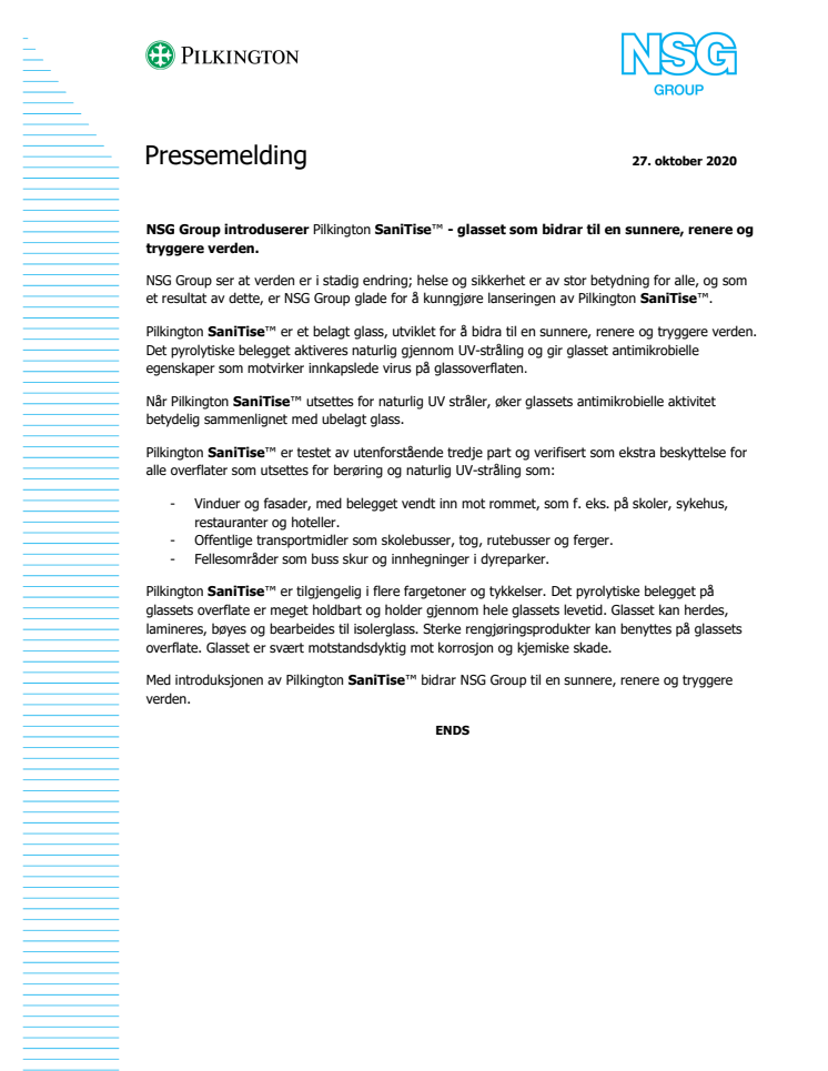 NSG Group ser at verden er i stadig endring; helse og sikkerhet er av stor betydning for alle, og som et resultat av dette, er NSG Group glade for å kunngjøre lanseringen av Pilkington SaniTise™.