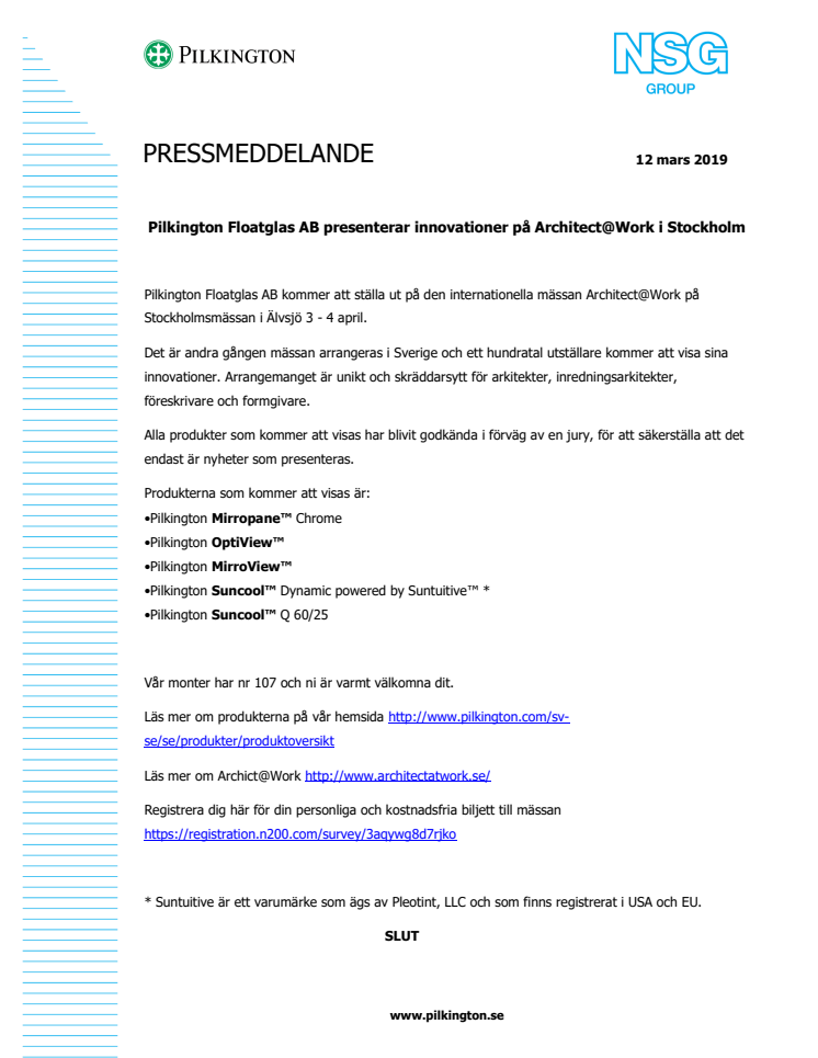 Pilkington Floatglas AB kommer att ställa ut på den internationella mässan Architect@Work på Stockholmsmässan i Älvsjö 3 - 4 april.