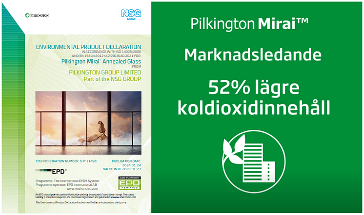 Pilkington Mirai™ arkitekturglas, produceret af NSG Group, er blevet verificeret af uafhængig tredjepart til at have 52% mindre mængde indlejret kuldioxid sammenlignet med standard floatglas, hvilket gør det til glasset med det laveste klimaaftryk af sin art.