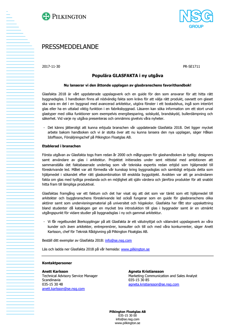 Beställ ditt exemplar av Pilkington GLASFAKTA 2018: info@se.nsg.com