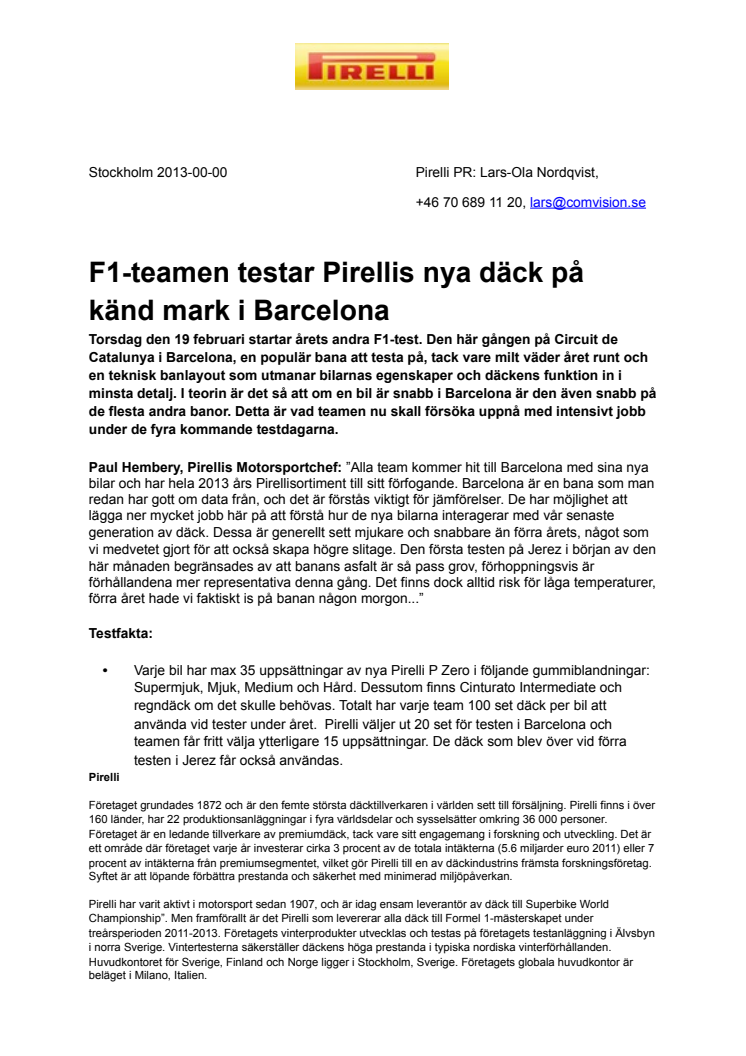 Torsdag den 19 februari startar årets andra F1-test. Den här gången på Circuit de Catalunya i Barcelona, en populär bana att testa på, tack vare milt väder året runt och en teknisk banlayout som utmanar bilarnas egenskaper och däckens funktion in i minsta detalj. I teorin är det så att om en bil är snabb i Barcelona är den även snabb på de flesta andra banor.