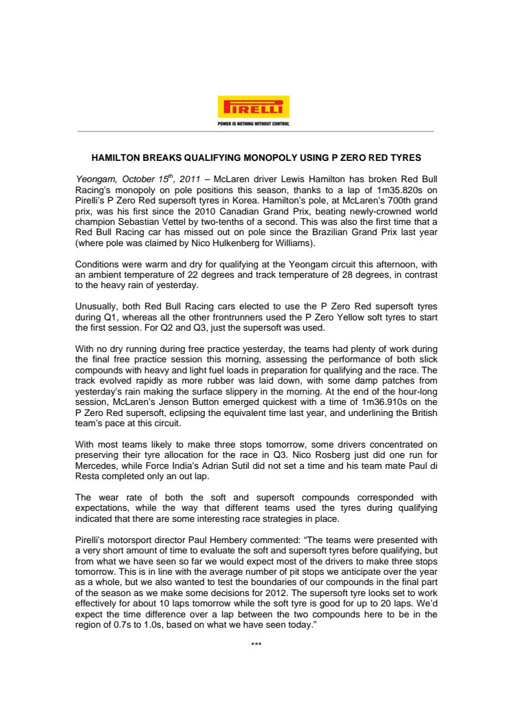 Hamilton och Pirelli Pzero supersoft i pole position inför Koreas GP