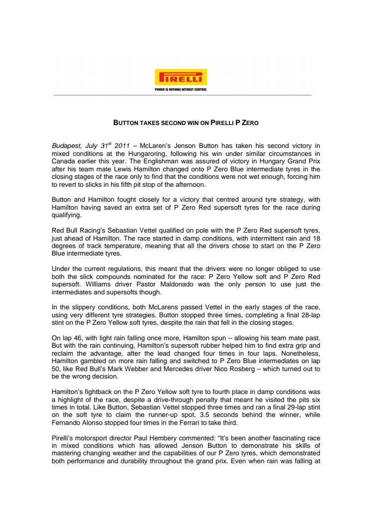 McLarens Jenson Button vann idag sin andra seger för i år i växlande väderförhållanden på Hungaroring. Button övertog ledningen från sin teamkompis Lewis Hamilton när denne gjorde ett strategiskt misstag och bytte till Intermediatedäck i slutet av racet när banan var på väg att torka upp, och blev sedan tvungen att göra ett sista, femte depåstopp.