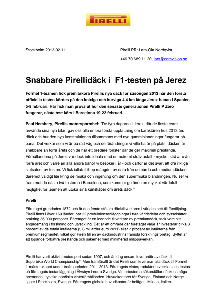 Formel 1-teamen fick premiärköra Pirellis nya däck för säsongen 2013 när den första officiella testen kördes på den knixiga och kurviga 4,4 km långa Jerez-banan i Spanien 5-8 februari. Här fick man prova ut hur den senaste generationen Pirelli P Zero fungerar, nästa test körs i Barcelona 19-22 februari.