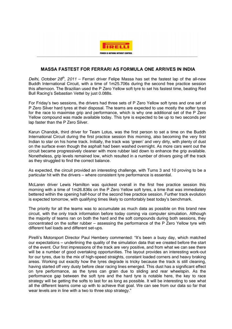 Världsmästaren Sebastian Vettel var som vanligt snabbast i kvalet - för 13:e gången i år - när Formel 1 för första gången körde på den nybyggda F1-banan Buddh International Circuit. Eftersom banan är ny för både team och däckstekniker har Pirelli med sig däck för att täcka alla eventualiteter: Den hårda, silvermarkerade gummiblandningen och den gula, mjuka blandningen av Pirellis PZerodäck.