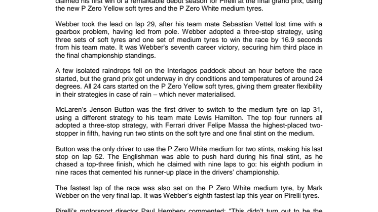 Mark Webber vann årets sista Grand Prix och avslutade Pirellis framgångsrika comebacksäsong.
