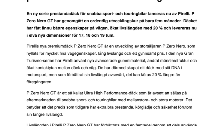 En ny serie prestandadäck för snabba sport- och touringbilar lanseras nu av Pirelli. P Zero Nero GT har genomgått en ordentlig utvecklingskur på bara fem månader. Däcket har fått ännu bättre egenskaper på vägen, ökat livslängden med 20 % och levereras nu i elva nya dimensioner för 17, 18 och 19 tum.