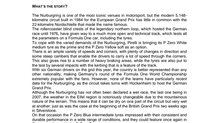 "Nürburgring är en av säsongens mest tekniska banor med stora påfrestningar i sidled för däcken, något som gör teamens strategi mycket viktig. Fortfarande finns det stora skillnader i varvtiderna mellan de mjuka, gula och de vitmarkerade medium-däcken vi valt till helgens tävling. Det här såg vi senast i Valencia under Europas GP. Största skillnaden mot Spanien är självklart vädret, här i Tyskland är det troligen kallare förhållanden. Vi tror att teamen i första hand kommer välja en tvåstoppsstrategi, förutsatt att det inte regnar, då kan vad som helst hända.