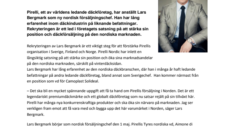 Pirelli, ett av världens ledande däckföretag, har anställt Lars Bergmark som ny nordisk försäljningschef. Han har lång erfarenhet inom däckindustrin på liknande befattningar. Rekryteringen är ett led i företagets satsning på att stärka sin position och däckförsäljning på den nordiska marknaden.