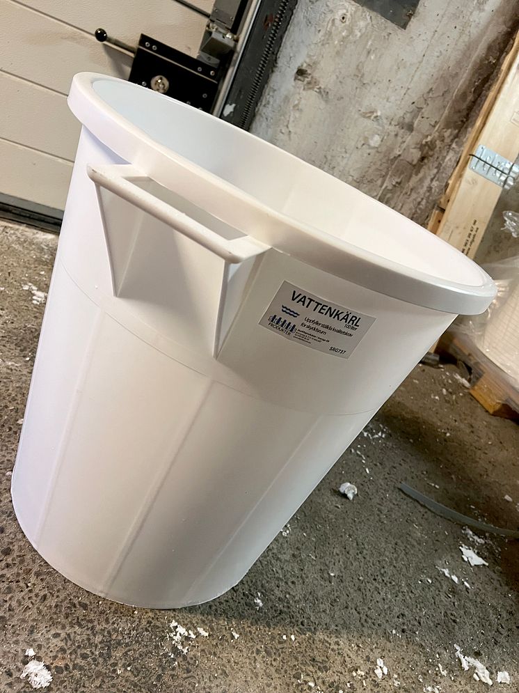 Ett vattenkärl rymmer 100 liter. I varje skyddsrum ska det finnas kärl som rymmer totalt 600 liter vatten.