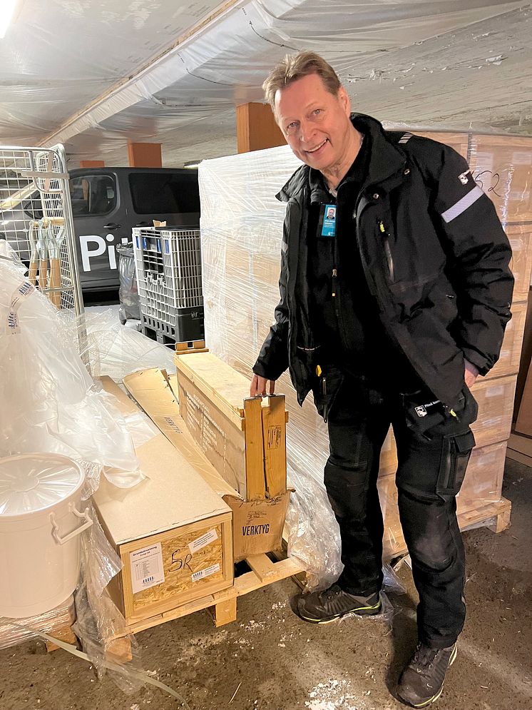 Klas-Göran Isaksson, fastighetsskötare, Fastighets- och serviceförvaltningen, visar hur verktygslådorna, en äldre variant och en nyare, ser ut som tillhör basutrustningen i ett skyddsrum.