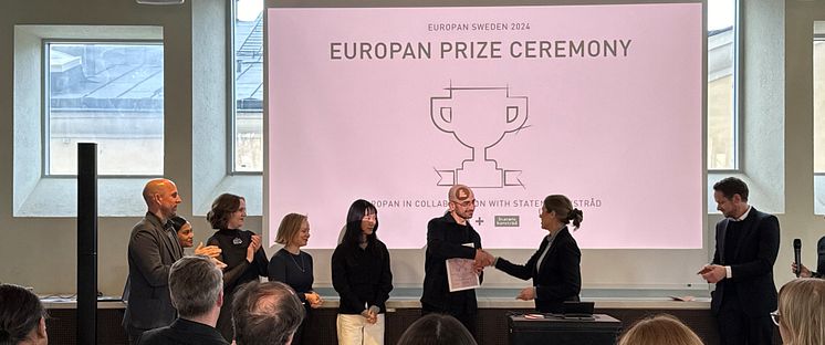 Riksarkitekten Helena Bjarnegård delar ut priset till det vinnande teamet.