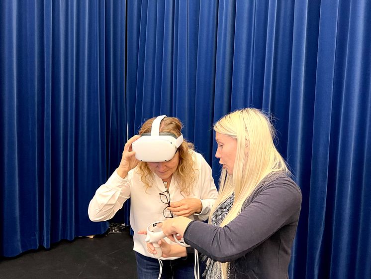 Linda Nyström instruerar Maria Fäldt i VR-utbildningen i föflyttningsteknik.
