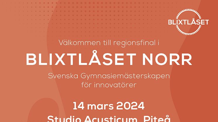 Den 14 mars kommer Blixtlåset regionsfinal, Svenska Gymnasiemästerskapet för innovatörer, till Piteå. Blixtlåset regionsfinal arrangerats av Teknikcollege Norrbotten och Piteå kommun stöttar arrangemanget. Denna deltävling går av stapeln vid Studio Acusticum med tävlande lag och jury från företagsvärlden.