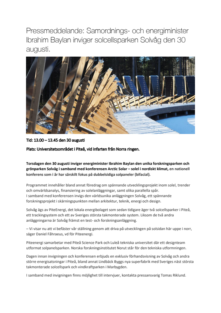 Torsdagen den 30 augusti inviger energiminister Ibrahim Baylan den unika forskningsparken och grönparken Solvåg i samband med konferensen Arctic Solar – solel i nordiskt klimat, en nationell konferens som i år har särskilt fokus på dubbelsidiga solpaneler (bifacial).
