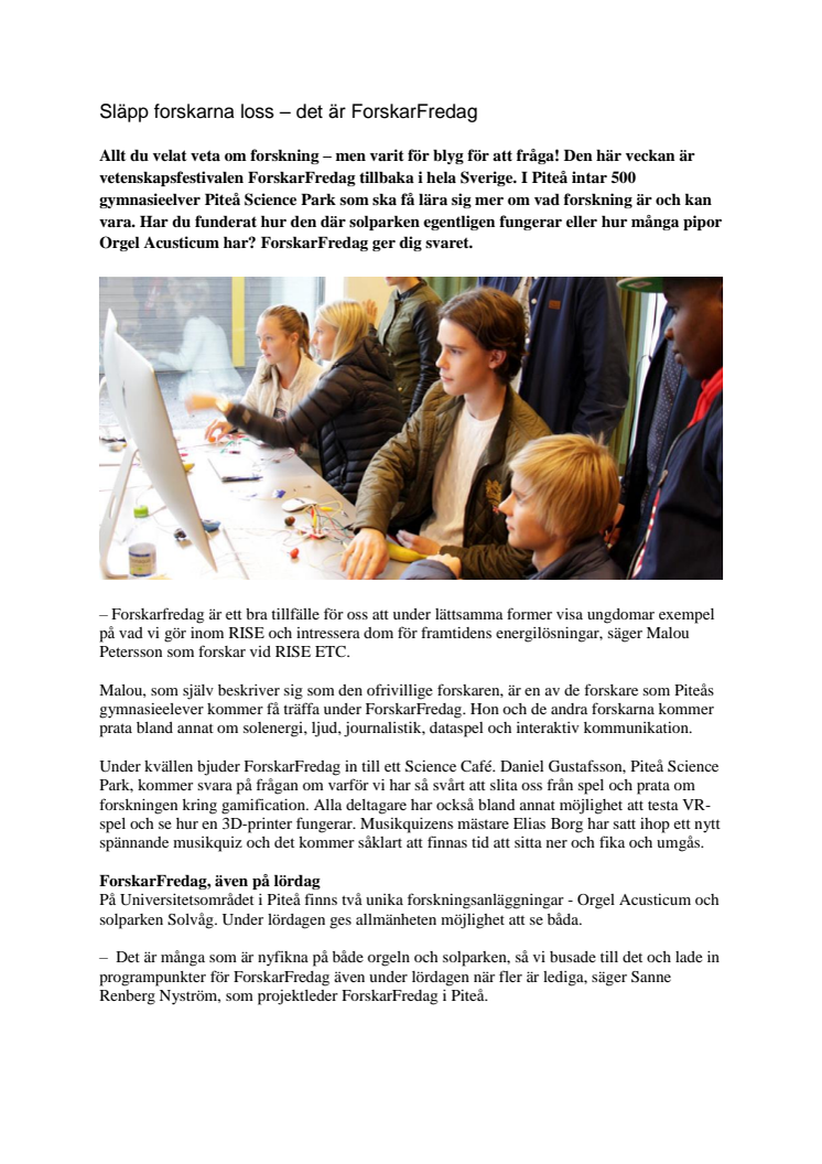 Allt du velat veta om forskning – men varit för blyg för att fråga! Den här veckan är vetenskapsfestivalen ForskarFredag tillbaka i hela Sverige. I Piteå intar 500 gymnasieelver Piteå Science Park som ska få lära sig mer om vad forskning är och kan vara. Har du funderat hur den där solparken egentligen fungerar eller hur många pipor Orgel Acusticum har? ForskarFredag ger dig svaret.