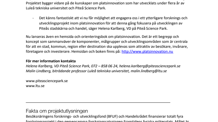 Luleå tekniska universitet och Piteå Science Park har beviljats 1,6 miljoner till projektet "Attraktiv stadskärna genom platsinnovativa synergier" av Besöksnäringens forsknings- och utvecklingsfond (BFUF) och Handelsrådet. Syftet med projektet är att utveckla kunskap och koncept för en attraktiv stadskärna genom innovativa synergier mellan handel och besöksnäring, med avstamp i den expanderande norrländska kuststaden Piteå och med applikation även i Kirunas stadsomvandling. Projektet bygger vidare på de kunskaper om platsinnovation som har utvecklats under flera år av Luleå tekniska universitet och Piteå Science Park.
