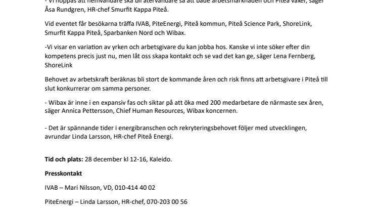 Vid eventet får besökarna träffa IVAB, PiteEnergi, Piteå kommun, Piteå Science Park, ShoreLink, Smurfit Kappa Piteå, Sparbanken Nord och Wibax.