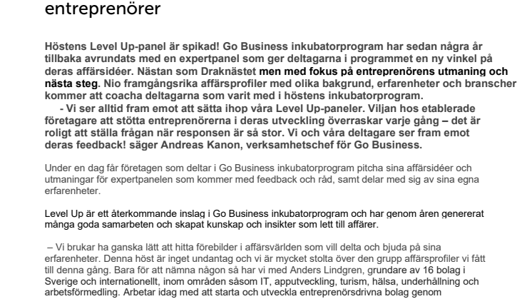 - Vi ser alltid fram emot att sätta ihop våra Level Up-paneler. Viljan hos etablerade företagare att stötta entreprenörerna i deras utveckling överraskar varje gång – det är roligt att ställa frågan när responsen är så stor. Vi och våra deltagare ser fram emot deras feedback! säger Andreas Kanon, verksamhetschef för Go Business.