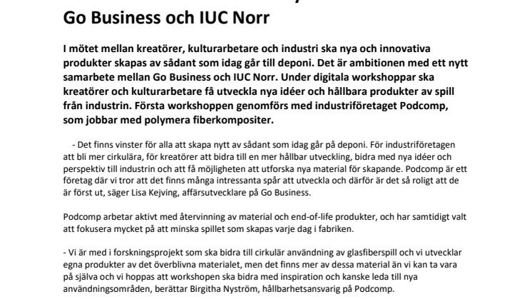 I mötet mellan kreatörer, kulturarbetare och industri ska nya och innovativa produkter skapas av sådant som idag går till deponi. Det är ambitionen med ett nytt samarbete mellan Go Business och IUC Norr. Under digitala workshoppar ska kreatörer och kulturarbetare få utveckla nya idéer och hållbara produkter av spill från industrin. Första workshoppen genomförs med industriföretaget Podcomp, som jobbar med polymera fiberkompositer.