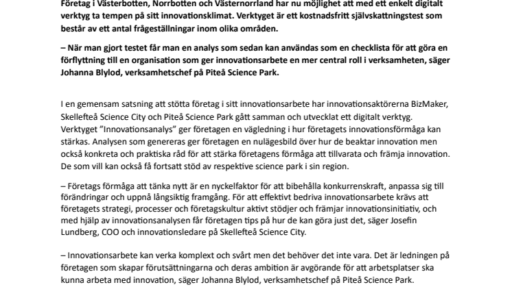 I en gemensam satsning att stötta företag i sitt innovationsarbete har innovationsaktörerna BizMaker, Skellefteå Science City och Piteå Science Park gått samman och utvecklat ett digitalt verktyg. Verktyget ”Innovationsanalys” ger företagen en vägledning i hur företagets innovationsförmåga kan stärkas. Analysen som genereras ger företagen en nulägesbild över hur de beaktar innovation men också konkreta och praktiska råd för att stärka företagens förmåga att tillvarata och främja innovation. De som vill kan också få fortsatt stöd av respektive science park i sin region.