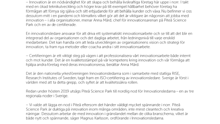 – Innovation är en nödvändighet för att skapa och behålla livskraftiga företag här uppe i norr. I takt med en ökad teknikutveckling och högre krav på till exempel hållbarhet behöver företag ha förmågan att förnya sig själva och sitt erbjudande för att behålla kunder och växa. Nu befinner vi oss dessutom mitt i en pandemi och klimatkris vilket gör att det är viktigare än någonsin att jobba med innovation – i alla organisationer, menar Anna Mård, chef för innovationsarenan på Piteå Science Park och en av de certifierade.