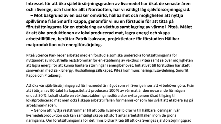 Intresset för att öka självförsörjningsgraden av livsmedel har ökat de senaste åren och i Sverige, och framför allt i Norrbotten, har vi väldigt låg självförsörjningsgrad. – Mot bakgrund av en osäker omvärld, hållbarhet och möjligheten att nyttja spillvärme från Smurfit Kappa, genomför vi nu en förstudie för att titta på förutsättningarna för en etablering av växthus samt lagring av värme i Piteå. Målet är att öka produktionen av lokalproducerad mat, lagra energi och skapa arbetstillfällen, berättar Patrik Isaksson, projektledare för förstudien Hållbar matproduktion och energiförsörjning.